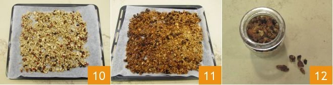 Pour the obtained mixture onto a baking sheet lined with parchment paper. Spread evenly with the spatula 10, then bake in a preheated static oven at 320°F (160°C) for 30 minutes on the center rack. Once baking is complete, remove your granola, which should be golden brown, and let it cool for at least 30 minutes at room temperature 11. After this time, the homemade granola will be ready: store it in a glass jar until you are ready to consume it 12.