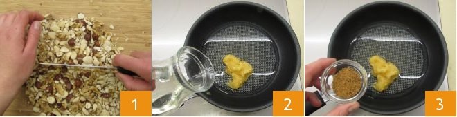 To make homemade granola, first rinse the raisins and goji berries. Then coarsely chop the hazelnuts, almonds, and walnuts 1. Proceed with the syrup: in a pan, pour the honey, water, oil 2, and sugar 3.