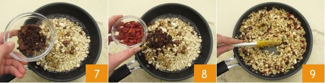 Cook for 10 minutes over medium heat to create a syrup 4, then turn off the heat and add the rolled oats 5 and chopped nuts 6.