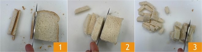 To make homemade panko, first remove the crust from the sandwich bread 1, then cut the crumb into chunks 2 3.