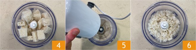 Transfer the bread into a mixer 4 and blend 5: you should obtain coarse crumbs, not too fine 6.