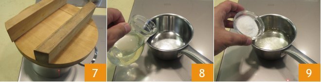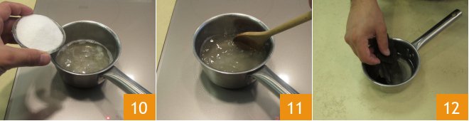 Then add the sugar 10, stir 11, and turn off the heat. Let cool and add the kombu seaweed 12. A tip is to wash the kombu seaweed before adding it to the mixture to remove the white coating sometimes present on the outside and reduce the salty intake.