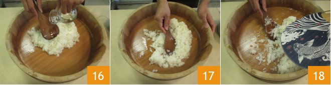 and add the filtered vinegar mixture, letting it drip on the spoon to spread it over the rice 16. Stir the rice by moving it gently so as not to crush it 17. It's important to stir until it appears shiny and well-seasoned. To cool it, fan it 18 so the vinegar evaporates quickly.