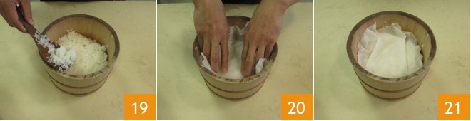 Once seasoned, transfer the rice to the ohitsu 19, the wooden container to maintain the rice temperature. Cover it with a damp paper towel to keep the heat constant 20. Alternatively, you can use a wooden or steel container covered with a damp cloth. When the rice is at about 97°F, you can use and serve it for your sushi 21.
