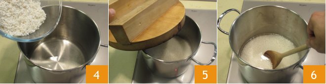 Add the cleaned rice 4. Usually, the rice-water ratio is 1:1, but it may vary depending on the season: less is needed in fall, more in spring. Turn on the heat and cover the pot with a lid: we used a wooden one 5, but alternatively, you can use a regular one. When it starts to boil, stir the rice once with a wooden spoon 6 for even cooking. Cook on medium heat for 5 minutes, then reduce the heat and cook for another 7 minutes on low.