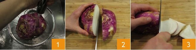 To make glazed turnips, first wash the turnips under running water 1, then dry them and cut them in half 2 to slice them more easily; you should obtain slices about 1/4 inch thick 3.