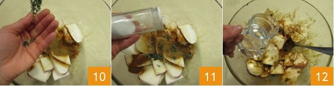 Fragrant with thyme leaves 10, then salt 11 and pour the water 12.