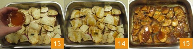 Stir to flavor the turnips well, then transfer them to a baking dish and pour the remaining 0.2 oz of honey 13 over the entire surface 14. Cook the turnips in a preheated static oven at 392°F for 35-40 minutes, occasionally drizzling the turnip surface with the cooking juice. Once the cooking is finished, remove the honey and spice glazed turnips from the oven 15, let them cool slightly, and then serve them accompanying meat or fish main courses.