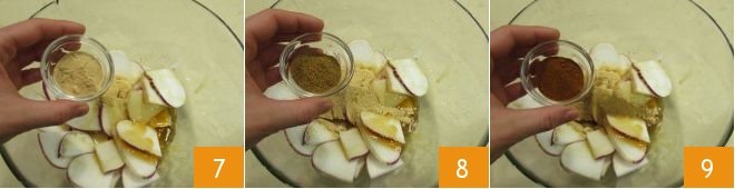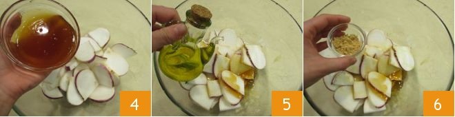 Transfer the sliced turnips to a large bowl, pour in the 5 oz of honey 4, drizzle with olive oil 5, and season with the powdered spices. Mustard 6