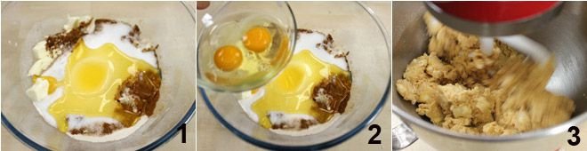 To prepare the honey cookies, start by placing in a large bowl (or on a work surface), 2 1/2 cups of flour (keep about 1/3 cup aside and adjust if needed later), the sugar, the butter, the honey (preferably a thicker type) 1, the two eggs, the spices, and the baking powder 2; put everything in a stand mixer and knead the ingredients well until a smooth and uniform dough is obtained.