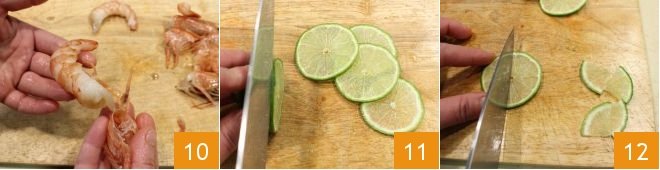 In the meantime, How to clean shrimp: remove the head and legs, remove the shell 10, and use a toothpick to extract the vein. Slice the other lime into very thin slices 11 and then cut each into 4 wedges 12