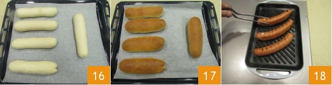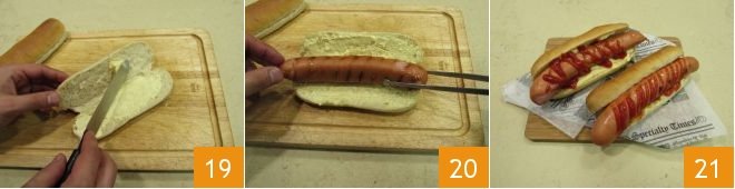 Then spread the mayonnaise inside the pocket 19. Insert a cooked sausage into the bread pocket 20 and, as a final touch, generously sprinkle with ketchup 21. Your hot dogs are now ready to be enjoyed!