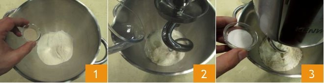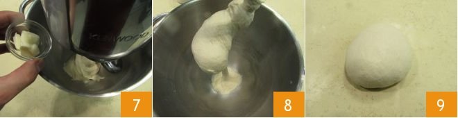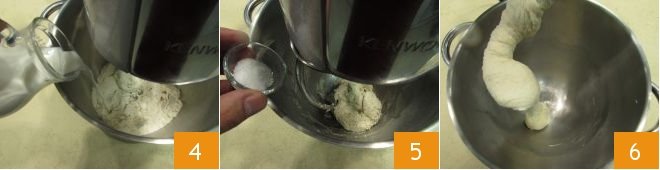 Now gradually add the room temperature milk 4; once absorbed, add the salt 5. Continue kneading with the hook until you obtain a soft and elastic dough; the dough should wrap around the hook and easily detach from the sides of the mixer bowl 6.