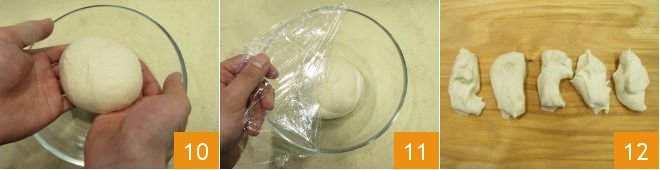 Place it in a large bowl 10 and let it rise, covered with plastic wrap, in a turned-off oven with the light on for 2-3 hours, until it doubles in volume 11. Once the dough has risen, transfer it back to the mixer and divide it into 5 equal parts 12.
