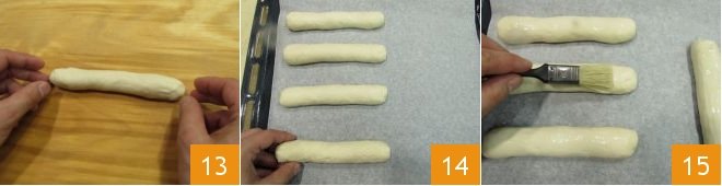Then take a piece and work it briefly to give it an elongated shape (about 6 inches) 13. Repeat the operation for all five pieces. Then place them on a baking sheet lined with parchment paper, at least 2 inches apart from each other 14. Now lightly brush your buns with some milk 15.