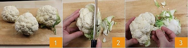 Choose firm, white cauliflowers without spots on the florets 1. Place the cauliflower on a cutting board and set it aside, holding it firmly with one hand. Use a knife to remove the stem and the outer leaves (2-3).