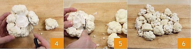 After removing the terminal part of the stem, use a small knife to separate the florets from the central stem, detaching them one by one (4-5). If the florets are particularly large, divide them further 6.