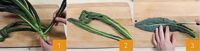 To clean black cabbage, remove the outer soft or damaged leaves from the central stem (1-2). Detach and set aside all the others, place them on the cutting board, and use a small knife to cut along the entire central vein 3.