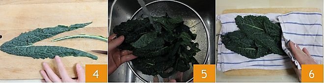 and remove it 4 as this is the hardest part and is not suitable for cooking. Rinse the cleaned leaves under cold running water 5 and dry them with a cloth or paper towel 6.