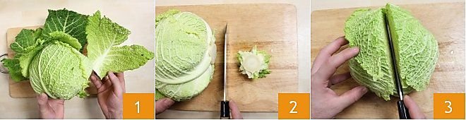 To prepare the savoy cabbage, start by removing the outer leaves if damaged and not firm 1. Place it on a cutting board and, holding it firmly with one hand, remove the final part 2, split it in half with a knife down to the end of the stem 3.