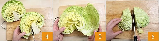 Now, from each half, use a small knife to cut out the stem and remove it 4. This way, you will detach each leaf from its root. If you need the whole leaf, for example, to prepare Savoy Cabbage Rolls, detach the leaves one by one 5 and rinse them under running water, and your savoy cabbage leaves are ready to be used. If you need to julienne the savoy cabbage, cut it in half again to create quarters 6.