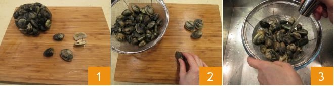 To clean the clams, first sort through them, removing any that are open or broken 1, as they might be dead, risky, or have a bad taste. Then tap each clam on a surface or cutting board 2 to help release some sand and impurities. Place them in a colander set over a bowl (ensure it doesn't touch the bottom) and rinse them multiple times under running water 3. You can soak them for a few minutes, then change the water several times, until there are no sand residues left at the bottom of the bowl.