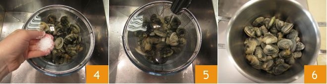 Another cleaning method is using salt: you can add coarse salt to the soaking clams (4-5): this recreates a condition similar to seawater, and the clams will easily purge the sand. Let them purge for a couple of hours, periodically checking if they release sand, and if so, shake them and change the water at least a couple of times until you no longer see traces of sand. Once the clams are clean, they will be ready to cook. To open the clams, put them in a large pan 6; it's common to season with a clove of garlic and a drizzle of oil.