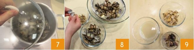 Cover the pan with a lid 7 and cook over high heat: this way, the shells will open with the heat. Turn off the heat immediately after they fully open to preserve the tenderness of the seafood without overcooking. Drain the clams (you can save the cooking liquid if needed), shell them 8, and they will be ready to use in your recipes!