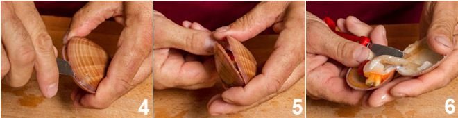 Now proceed to remove the grayish skin covering the fruit and the intestine sac, which contains small stones that, if left inside, will give the sensation of sand in the product (7-8). Detach the fasolaro also from the bottom part of the shell 9. If you want to consume it raw, the fasolaro is ready, and, taking care to retain its liquid inside the shell, you can season it with a bit of pepper or lemon juice.
