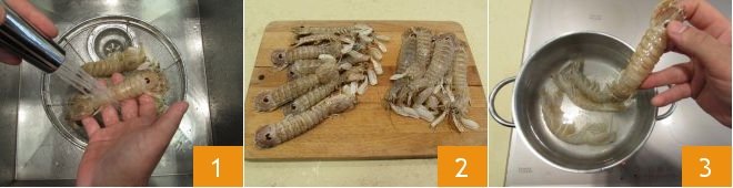 There are several methods to clean mantis shrimp. Depending on the use, the method varies. First of all, in any case, you must wash the live shrimp under running water 1, being careful not to injure yourself with their spiny tails. To prepare pasta sauces or flavorful soups, it will be sufficient to cut them into pieces with a sharp knife. To cook them whole 2, you will need to make a cut along the dorsal shell so that the meat absorbs flavors more easily during cooking. If you wish, you can completely free the mantis shrimp from the dorsal shell, keeping only the meat, to make it easier for your guests or for particular preparations. In this case, to simplify the operations, dip them for just 2 minutes in a pot full of boiling water 3.