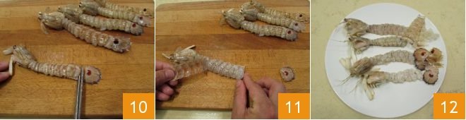 Also cut the tail 10, which has some spiny protrusions. With your right hand, hold the shrimp firmly on the work surface, and with your left, gently lift the dorsal shell, from the tail towards the head 11. This way, all the meat will be exposed 12.
