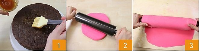 Take the cake you want to use, we prepared the Mud cake because this base lends itself well to being covered with fondant; if you prefer, you can also prepare a Sponge cake. Using a brush, coat the entire surface and sides of the cake with apricot or peach jam 1, this will serve as a “glue” to ensure the fondant perfectly adheres to the cake. To facilitate the process, we recommend placing the cake on a turntable if you have one. Dust a work surface with powdered sugar and roll out the room-temperature fondant using a cold fondant rolling pin on a cold, smooth surface 2. A regular work surface is not suitable because the fondant would not turn out perfectly smooth. You can use a silicone mat or simply parchment paper. Roll out the fondant to the desired size and thickness, we recommend not thinner than 1/8 inch, then roll the fondant onto the rolling pin 3