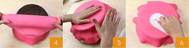 and lay the rolled fondant over the cake 4. Apply light pressure with your hands to adjust the fondant on the cake, then with a special fondant spatula ensure the fondant adheres perfectly without forming wrinkles or creases, use the fondant spatula to apply gentle pressure 5 on both the top of the cake 6