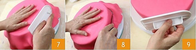 and the sides 7, then with a small knife cut off any excess fondant from the edges of the cake 8, keeping the knife blade close to the base, and refine the coverage by going over it with the spatula 9.