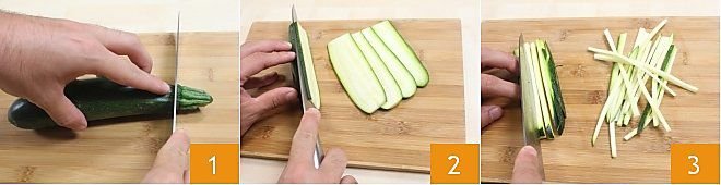 THE JULIENNE CUT The julienne cut consists of making slices about 1/12 inch thick, from which you derive strips of the same thickness. This cut is usually used to enhance preparations such as mixed salads. Let's see how to do it. Wash and dry a zucchini, for example, and place it on a cutting board. Remove the ends, then make the thin slices cut 2 and reduce each slice into very thin, square-section fillets 3. To speed up operations, you can stack the obtained slices and proceed normally with the cut.