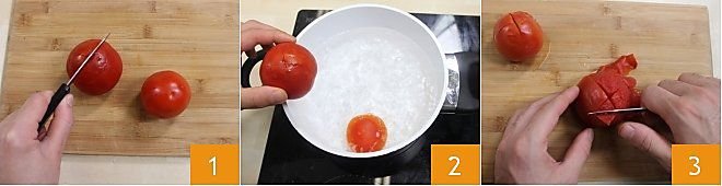 THE CONCASSER CUT The concasser cut is a type of cut used to chop blanched vegetables, particularly tomatoes. Let's see how to do it. Take the tomatoes and make a cross incision on the bottom of each one 1, then plunge them into boiling water, letting them cook for a few seconds 2, drain them, and immediately place them in plenty of cold water to cool them more quickly. Then remove the skin with the help of a knife; thanks to the previous cut, it will be much easier to peel them 3.