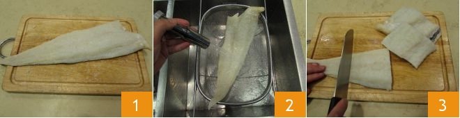 To desalt the cod fillet 1, place it under a stream of cold water to remove the excess salt 2; then cut it into pieces 3. If you prefer, you can also opt to keep the fish fillet whole: in this case, the desalting times will need to be extended.