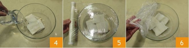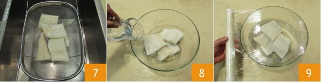Place the cod in a large bowl (if you prefer, laid on a colander) and cover it entirely with cold water 4: the water will help dissolve the salt and swell the fibers. This operation allows you to hydrate and soften the cod flesh that has dried out due to the preservation process. For this operation, we used a glass bowl, but if you prefer, you can use a plastic one or any material that is not attacked by salt. It would be preferable to leave the cod in the sink so that a trickle of running water can flow into the bowl continuously, ensuring continuous recycling. Cover the bowl with transparent food wrap 5 and place it in the refrigerator in the less cold part or in any case in a cool place, away from sources of light and heat. After 8 hours of soaking, remove the wrap 6.