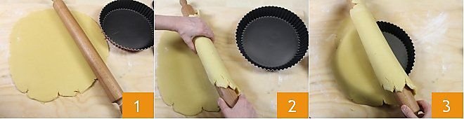 First, roll out the shortcrust pastry (click Shortcrust pastry for the recipe) if you're preparing a sweet dish, or the brisée pastry (click Easy Shortcrust Pastry for the recipe) for savory preparations. Place the shortcrust dough on a lightly floured work surface and roll it out with a rolling pin to a very thin thickness, about 1/8 inch 1, then wrap it around the floured rolling pin 2 and place it on a non-stick tart pan 3. We used a 9.5-inch pan for this amount of shortcrust pastry.