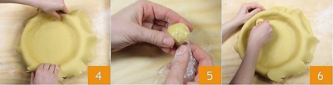 Make sure it adheres well to the tart pan 4. To assist you with this operation, you can take a leftover piece of dough, shape it into a ball, wrap it with cling film 5, and use it to press the pastry perfectly, applying light pressure on both the edges and the bottom 6.