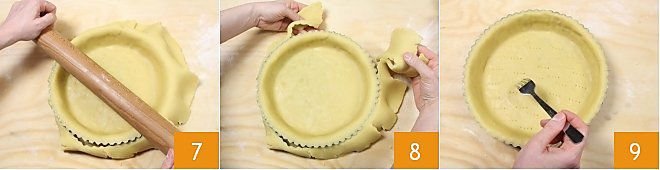 Then, use the rolling pin to press down on the upper edges of the tart pan to remove the excess shortcrust pastry (7-8); you can also cut away the excess pastry with a small knife. At this point, refrigerate the shortcrust pastry for 30 minutes, or 15 minutes in the freezer, to firm it up and help it maintain its shape.