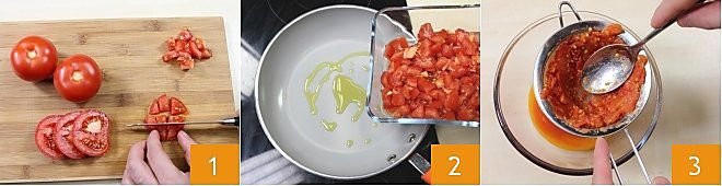 To prepare the vegetable coulis, you can use the vegetables you prefer; tomatoes, peppers, and zucchini are recommended because they are more watery: in our case, we chose to use tomatoes. Take the tomatoes, wash them very well, and cut them into cubes 1. Place them in a non-stick pan with a drizzle of oil, then let them soften over low heat until they have released all their vegetative water 2. At this point, turn off the heat and strain the mixture with a sieve to remove the seeds and skins 3,