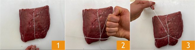 To tie the roast with a single string, slide the string under the piece of meat, then make a double knot at one end of the meat 1 2 and tighten well 3.