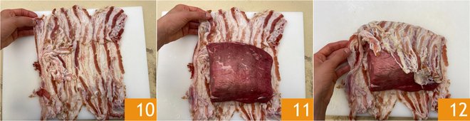 The method of wrapping is usually used for leaner pieces of meat, using fatty cured meats like lard or bacon. We used bacon to wrap the beef rump. Lay the slices of bacon on a cutting board, slightly overlapping them 10. Place the rump in the center 11, wrap it completely with the slices of bacon 12.