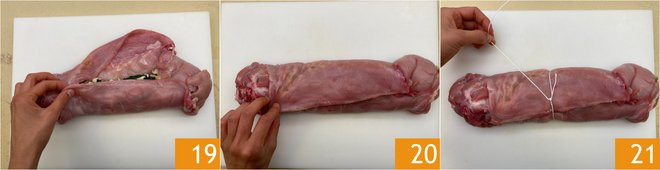In the case of a roll, the technique of multiple string ties is used, so you can remove the string as the preparation is portioned. Proceed by laying the meat on a cutting board, in this case, we used rabbit. Distribute the filling in the center 16. Fold the ends towards the center 17 18.