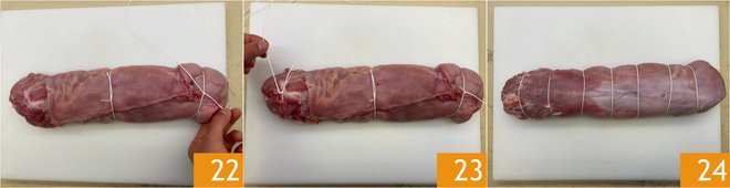 The most convenient way to arrange the slices of cured meat is horizontally to the meat, so with the piece of meat vertically in front of you, the cured meat will be horizontal. This arrangement can change depending on the type of meat and its size, the type of cured meat, and the length of the slices. At this point 13 proceed with the single string tie creating loops along the entire length of the meat, as previously explained 14. Once finished, turn the meat, cut the string leaving it longer than the piece of meat to make the final knot always tightly 15.