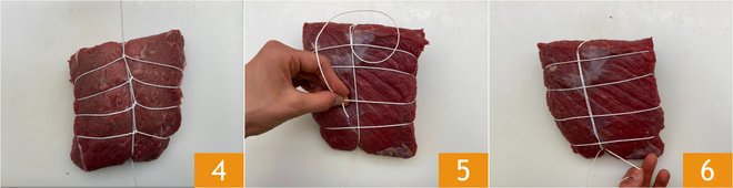 Then make two loops with the string around your hand to create a small loop, slide it along the meat and position it towards the end, near the first knot you made. Tighten well by pulling the loop, then proceed to create the cage, making another double loop of string around your hand to create the loop, and passing the loop along the entire meat, close to the first loop, always tightening well. Continue like this for the whole piece 4. At the last loop, turn the meat and cut the string, leaving it longer than the piece of meat, and pass it between the loops, alternating one yes and one no 5. Pull the string tightly and secure it with a double knot at the end 6.
