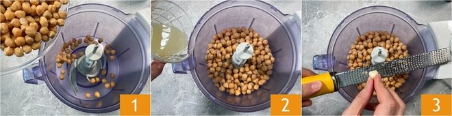 To prepare the hummus without tahini, place the drained pre-cooked chickpeas in a blender 1, then add the lemon juice 2 and grate one clove of garlic 3.