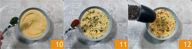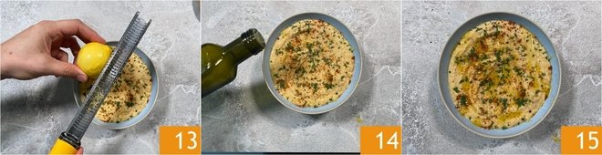 Season with lemon zest 13 and finish with a drizzle of oil 14. Your hummus without tahini is ready to be served 15!