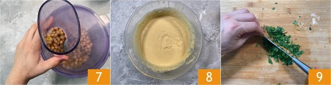 Close the blender 7 and blend until you get a creamy consistency 8. If it still seems lumpy, add a little water at a time. Now focus on the decoration: finely chop the parsley 9.